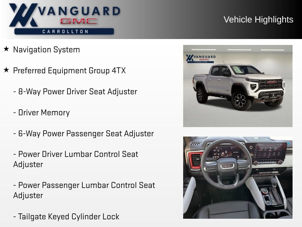 Experience the ultimate in rugged capability and premium comfort with the 2026 GMC Canyon AT4X Safety Plus Package. This exceptional midsize truck is engineered to conquer any terrain while providing a refined and technologically advanced driving experience.Packed with an impressive array of features, this Canyon stands out from the crowd: Navigation System Premium 7-Speaker Bose Sound System Dual-Zone Automatic Climate Control Air Conditioning 120-Volt Bed Mounted Power Outlet 8-Way Power Driver Seat Adjuster Driver Memory Rear of Console 120-Volt Power Outlet Remote Vehicle Starter System Off-Road Suspension Tilt and Telescopic Manual Steering ColumnThe Canyon's 2.7L I4 Turbocharged engine delivers a remarkable 310 horsepower, paired with an 8-speed automatic transmission and 4-wheel drive capabilities. With an EPA-estimated 18 MPG in the city and 22 MPG on the highway, this truck balances power and efficiency to meet your driving needs.Beyond its impressive performance, the Canyon AT4X Safety Plus Package offers unparalleled safety and technology features. Adaptive Cruise Control, Automatic Emergency Braking, and Front Pedestrian and Bicyclist Braking provide peace of mind on the road. The Blind Zone Steering Assist with Trailering, Rear Cross Traffic Braking, and Rear Pedestrian Alert further enhance your driving confidence.Elevate your driving experience with the premium amenities of the Canyon AT4X Safety Plus Package, including the Multicolor 6.3 Diagonal Head-Up Display, Wireless Phone Charging, and the Integrated Trailer Brake Controller. The Trailering App System and Underbody Cameras make towing and off-road adventures a breeze.Indulge in the comfort and convenience of the Canyon's Heated and Ventilated Front Seats, Heated Steering Wheel, and Power Lumbar Support. The Multicolor 6.3 Diagonal Head-Up Display and Bose Sound System ensure you stay connected and entertained on every journey.Discover the perfect blend of capability, technology, and luxury in the 2026 GMC Canyon AT4X Safety Plus Package. Experience the ultimate in midsize truck performance and refinement. Visit our showroom today to take this exceptional vehicle for a test drive and make it your own.