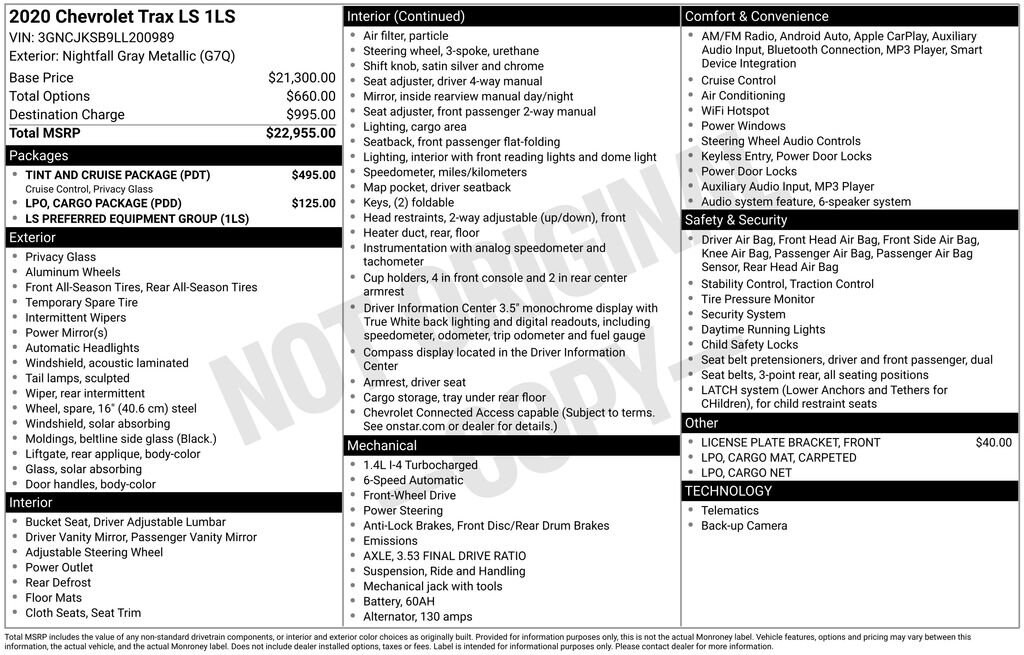 2020 Chevrolet Trax LSThis vehicle comes with the following features and options :Contingent upon dealer acceptance of terms. Terms may vary. Certification and additional reconditioning fees may apply.