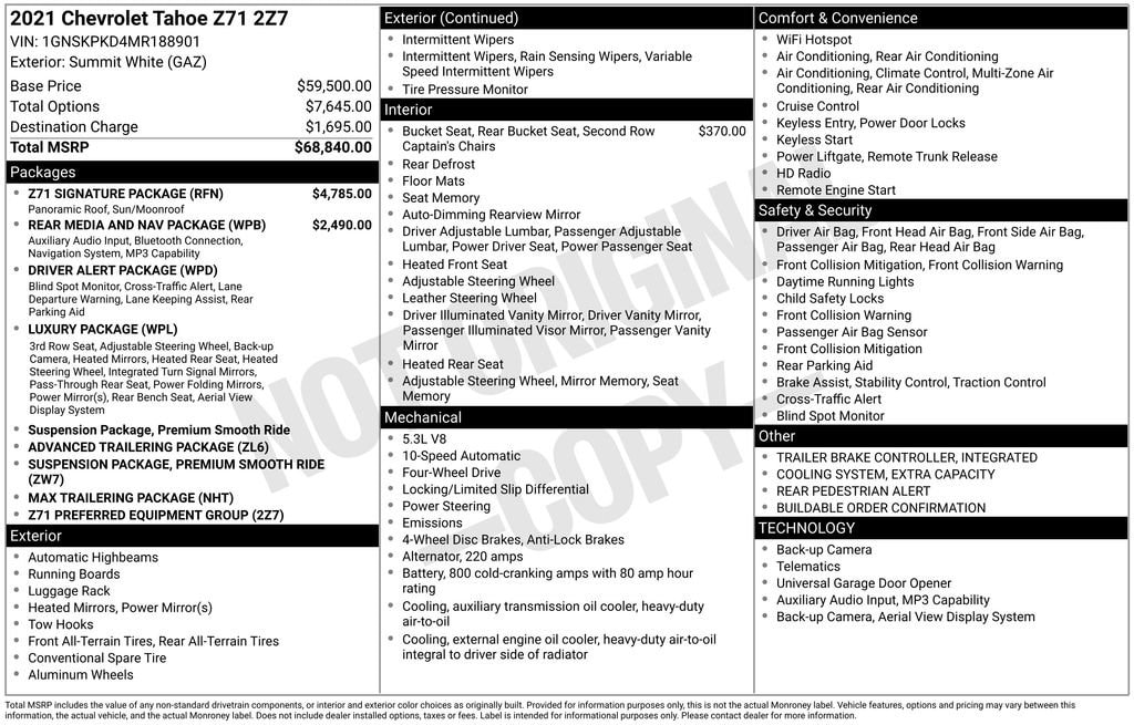 2021 Chevrolet Tahoe Z71This vehicle comes with the following features and options : 4WD, Gideon/Very Dark Atmosphere Leather.Awards:* JD Power Automotive Performance, Execution and Layout (APEAL) Study * ALG Residual ValueALL VEHICLES SUBJECT TO A $225 DEALER DOC FEE. USED VEHICLES PRE-LOADED WITH OUR VIP PACKAGE FOR $1995. THIS INCLUDES 1 YEAR OIL CHANGES AND TIRE ROTATIONS. ONE YEAR INTERIOR AND EXTERIOR PROTECTION. 1 YEAR THEFT PROTECTION. LIFETIME POWERTRAIN WARRANTY* SOME EXCLUSIONS APPLY TO THE LIFETIME WARRANTY.