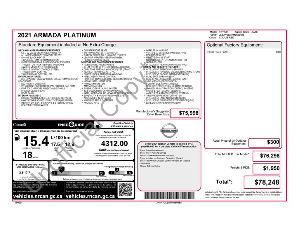 2021 Nissan Armada PlatinumClean CARFAX. This vehicle comes with the following features and options : 4WD.Contingent upon dealer acceptance of terms. Terms may vary. Certification and additional reconditioning fees may apply.