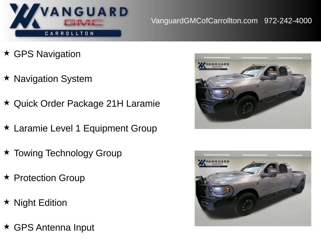 Elevate your driving experience with this exceptional 2024 Ram 3500 Laramie. Boasting a powerful 6.7L I6 Cummins Turbo Diesel engine, this heavy-duty pickup is engineered to conquer any challenge. Outfitted with a suite of advanced features, this Laramie model delivers unparalleled capability, comfort, and style.- 6.7L I-6 Diesel Turbocharged HO (Cummins) with Aisin 6-Speed Automatic Transmission and 4WD- Night Edition with Black Exterior Accents and Upgraded Interior Styling- Towing Technology Group with Surround View Camera System and Trailer Reverse Guidance- Dual Rear Wheels for Increased Payload and Towing Capacity- MOPAR Spray-In Bedliner for Rugged Cargo ProtectionThis Ram 3500 Laramie is more than just a workhorse it's a premium-appointed truck that elevates every journey. Sink into the plush leather-trimmed bucket seats and experience the unparalleled comfort of the heated front seats and heated steering wheel. Stay connected with the advanced Uconnect 5 infotainment system, featuring a massive 12-inch touchscreen display, Apple CarPlay, Android Auto, and SiriusXM with 360L.For added confidence on the road, this Laramie model comes equipped with a suite of advanced safety features, including Blind Spot and Cross-Path Detection, ParkSense Front and Rear Park Assist, and the Surround View Camera System. Whether you're hauling heavy loads or navigating tight spaces, this Ram 3500 has your back.Elevate your driving experience and take command of the road with this exceptional 2024 Ram 3500 Laramie. Visit our showroom today to see this remarkable vehicle in person and discover how it can transform your driving lifestyle.